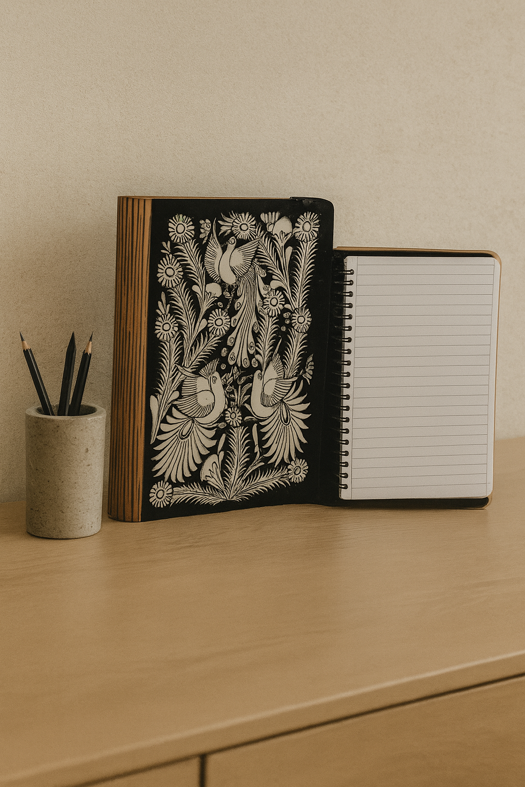 Porta libreta en MDF (aglomerado de madera) pintado a mano con técnica Xalitla Aves en la cual artesanos mexicanos de Xalitla, Guerrero, dibujan flora y aves de la región. Interior con material sintético para colocación de libreta.